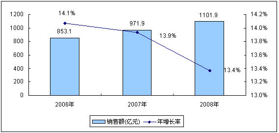- 2008年銷售額達(dá)到1101.9億元,與2007年市場(chǎng)規(guī)模相比,增長(zhǎng)13.4%