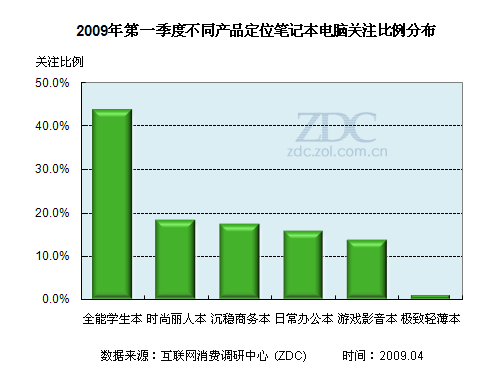 根據(jù)有關(guān)資料顯示,在目前我國高校學(xué)生數(shù)量不斷增加的大背景下,學(xué)生市場將可能成為未來5至10年內(nèi)我國筆記本電腦市場中至關(guān)重要的一塊。因此學(xué)生市場成為廠商爭奪的焦點,紛紛推出定位于學(xué)生用戶的筆記本。調(diào)查數(shù)據(jù)顯示,第一季度全能學(xué)生本在市場上的關(guān)注度最高,占據(jù)四成以上的關(guān)注比例。