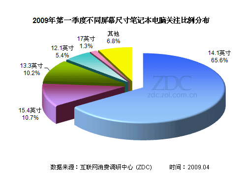 調(diào)查數(shù)據(jù)顯示,14.1是目前最主流的筆記本尺寸,第一季度獲得65.6%的關(guān)注比例。ZDC認(rèn)為,目前14英寸筆記本是各大廠商的主打產(chǎn)品,其產(chǎn)品配置由高到低,可選擇范圍廣,外觀樣式也豐富多彩,同時經(jīng)典產(chǎn)品更是層出不窮,在價格方面也要遠(yuǎn)優(yōu)于同性能的12、13英寸筆記本,所以這個尺寸的筆記本成為主流絕非偶然。