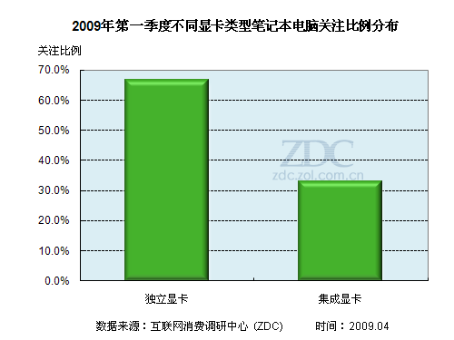 據(jù)ZDC 2009年第一季度的調(diào)查數(shù)據(jù)顯示,獨立顯卡筆記本更勝一籌,以66.8%的關(guān)注比例領(lǐng)先于集成顯卡機型。集成顯卡筆記本的關(guān)注比例為33.2%。二者的關(guān)注比例相差較大。