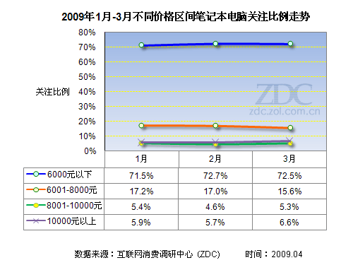 (圖) 2009年1月-3月不同價格區(qū)間筆記本關(guān)注比例走勢