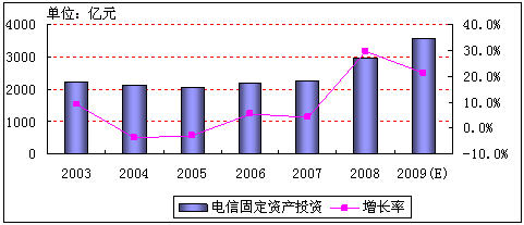 2009年伊始,3G牌照的發放預示著中國3G時代的到來。三大運營商紛紛加大3G網絡建設的投資力度,作為運營商運維設備的重要組成部分,通信測試市場有望迎來快速增長。圖1顯示,2004-2005兩年電信投資基本維持原有水平,2006-2007年期間投資力度出現小幅增長。2008年電信固定資產投資總額近3000億元,較2007年有大幅提升。2009年由于3G的啟動,電信投資有望進一步加大力度??梢灶A計未來兩到三年,中國電信固定資產投資將進入高速增長期。