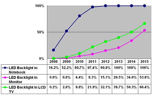 同時,2013年采用LED背光的大尺寸(指10寸及以上尺寸)面板出貨量將從2009年約8千490萬片成長到4億3千480萬片,將占LED背光市占率估計為54.3%,LED背光將成為市場主流規(guī)格。其中notebook PC將是LED背光主要應用,依據(jù)DisplaySearch分析到了2012年百分之百notebook PC都將采用LED背光。
