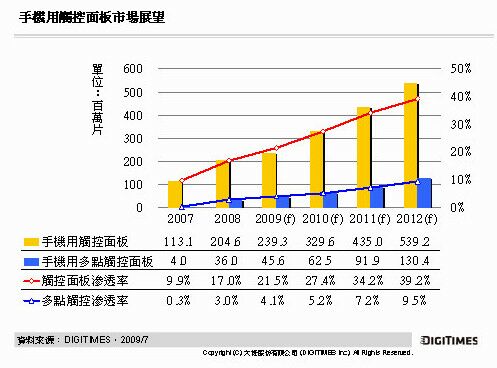 - 預計至2012年,全球手機將有39.2%采用觸控面板,而具備多點觸控功能者則將達9.5%