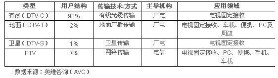 根據不同傳輸方式,中國DTV主要分為有線數字電視、地面數字電視、衛星數字電視以及IPTV四種類型。(傳統意義上數字電視分有線、地面及衛星三種類型。但AVC認為,從應用角度來講,IPTV是數字電視的一種特殊表現形式,故將IPTV也列入比較之列)