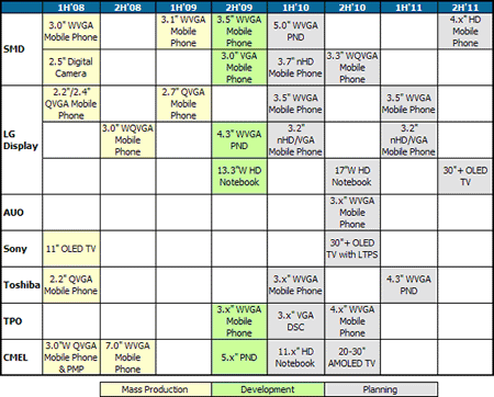 表一: 各家AMOLED制造商的產品生產計劃 (2008~2011)