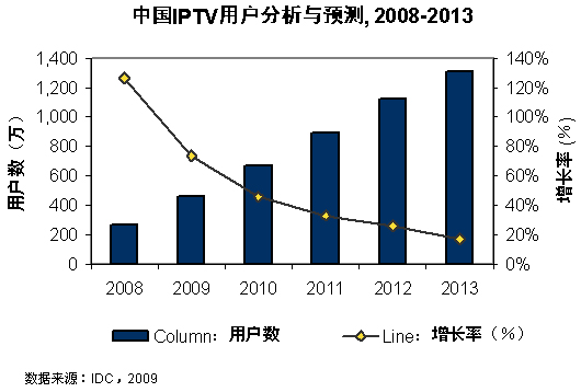 在未來(lái)幾年中,可以預(yù)見(jiàn),無(wú)論是出于集團(tuán)利益還是內(nèi)容監(jiān)管的需要,對(duì)IPTV的監(jiān)管不會(huì)有本質(zhì)的顯著改變,中國(guó)IPTV仍將在一段時(shí)期內(nèi)處于非完全市場(chǎng)化的發(fā)展和競(jìng)爭(zhēng)狀態(tài),但是隨著產(chǎn)業(yè)環(huán)境的完善和消費(fèi)者認(rèn)知和接受程度的提高,IPTV的用戶規(guī)模必將穩(wěn)步擴(kuò)張。IDC預(yù)計(jì),2009年中國(guó)IPTV用戶將達(dá)到460萬(wàn),同比增長(zhǎng)73.6%,2013年將達(dá)到1310萬(wàn)用戶的規(guī)模。在這個(gè)過(guò)程中,已經(jīng)將IPTV定位為未來(lái)戰(zhàn)略轉(zhuǎn)型業(yè)務(wù)的電信運(yùn)營(yíng)商和尋求新媒體發(fā)展機(jī)遇的內(nèi)容運(yùn)營(yíng)商,將需要通過(guò)更加專業(yè)細(xì)分的內(nèi)容整合、更加關(guān)注用戶體驗(yàn)的營(yíng)銷策略,來(lái)驅(qū)動(dòng)市場(chǎng)的進(jìn)一步發(fā)展。