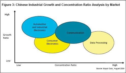 汽車與工業電子市場具有多樣化與分散化特點。但在中國,未來五年內,這兩個領域將是所有應用領域中增長最快的。工業高速增長和制造業集約化程度低,為分銷商提供了許多商業機會。圖3所示為iSuppli公司對中國工業增長與集中程度的分析,按市場細分。