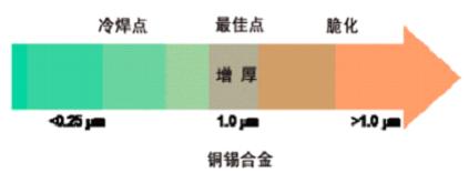 更高溫度和與被焊接部件更長時間的接觸也可能增加金屬化合物的結(jié)合層。從而不建議延長接觸時間和重復返工。上圖表顯示了隨著結(jié)合層的厚度增加,脆化現(xiàn)象發(fā)生的機率就更大。[page]