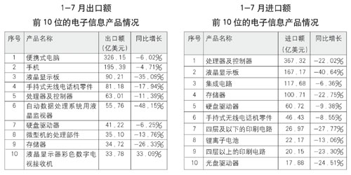 1-7月,通信設備產品進口額為103.75億美元,同比下降0.67%;廣播電視設備進口額為26.28億美元,同比下降31.87%;計算機類產品進口額為223.16億美元,同比下降20.83%;家用電子電器產品進口額為55.52億美元,同比下降21.63%;電子元件產品進口額為347.95億美元,同比下降37.50%;電子器件產品進口額為686.53億美元,同比下降20.15%;電子材料進口額為34.81億美元,同比下降33.55%;電子儀器設備進口額為108.26億美元,同比下降35.69%。