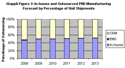 iSuppli公司對(duì)2008-2013年內(nèi)部和外包PND制造業(yè)務(wù)的預(yù)測(cè)。