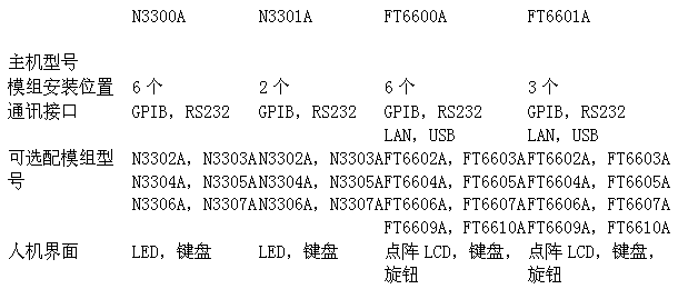 費思FT6600A和安捷倫N3300A各有兩款主機,分別最大可支持6個模組和3個模組;具體如下: