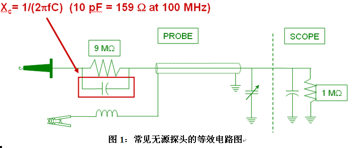 從無源探頭的原理來看,如圖1所示為常見的無源探頭的簡化電路圖,通常示波器標(biāo)配的無源探頭的直流輸入電阻為10兆歐(探頭的9兆歐與示波器前端1兆歐串聯(lián)),輸入電容為10pf左右,與9兆歐電阻并聯(lián)。當(dāng)待測(cè)試信號(hào)的頻率較高時(shí),容抗隨著頻率升高而減小,所以無源探頭整體的輸入阻抗變小,當(dāng)頻率為100MHz時(shí),輸入阻抗為159歐。