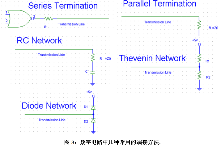 盡管并聯(lián)了100歐電阻后電路板能正常工作了,但是接收端測(cè)量到的峰峰值高達(dá)6.2V,對(duì)于SDRAM芯片3.3V的工作電壓來講還是比較大的,長期工作可能會(huì)導(dǎo)致內(nèi)存芯片出問題,所以,我們還需改進(jìn)端接策略。在信號(hào)完整性書籍中,通常有串聯(lián)匹配、并聯(lián)匹配、RC網(wǎng)絡(luò)、戴維南網(wǎng)絡(luò)等端接方法,如下圖3所示。相比并聯(lián)匹配,串聯(lián)匹配不用提供DC電流到地或者電源,不會(huì)對(duì)輸出的高低電平產(chǎn)生影響,能減小過沖和EMI,所以我們接著嘗試串聯(lián)匹配下的信號(hào)質(zhì)量。