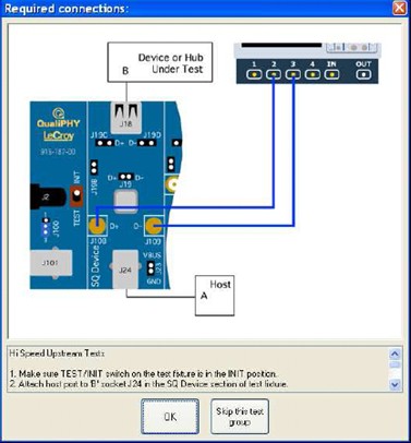 QualiPHY軟件的用戶界面設(shè)計非常人性化和直觀實用,它會以圖表化的方式顯示出一致性測試的每個環(huán)節(jié)中測試夾具、示波器主機和DUT三者之間的拓撲關(guān)系,使用者無需記憶,就能正確設(shè)置測試環(huán)境。下圖4清晰 顯示了USB2.0高速設(shè)備信號質(zhì)量測試中的夾具、DUT和示波器連接關(guān)系。