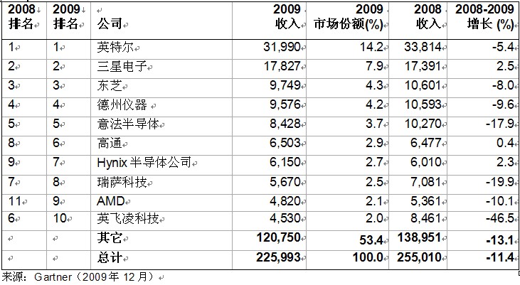 盡管收入下滑,英特爾公司連續18年來收入蟬聯首位。2009年,該公司的市場份額增加到14.2%。