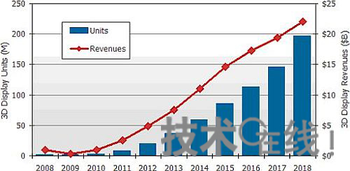 目前,3D(三維)顯示器非常引人注目。最新發(fā)布的《3D顯示器技術(shù)&市場(chǎng)調(diào)查報(bào)告》預(yù)測(cè),3D顯示器市場(chǎng)的供貨量和供貨金額將從2008年的70萬臺(tái)、9億200萬美元增長(zhǎng)至2018年的1億9600萬臺(tái)、220億美元(圖1)。如果市場(chǎng)果真按照該預(yù)測(cè)增長(zhǎng)的話,年均復(fù)合增長(zhǎng)率(CAGR)按金額計(jì)算將達(dá)到38%,按數(shù)量計(jì)算將達(dá)到75%。