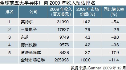 根據市場調研公司Gartner的估計,2009年全球半導體行業總收入為2.26億美元,同比下滑11.4%,這將是該行業25年來經歷的第六次收入下滑。 Gartner分析稱,個人電腦市場是最先反彈的市場,隨后是手機、汽車等市場開始反彈。此外,盡管收入下滑,英特爾仍連續18年蟬聯年收入額第一,2009年,該公司的市場份額增加到14.2%。
