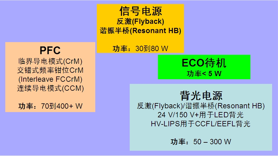 液晶電視電源包含功率因數校正(PFC)、信號電源、背光電源及ECO待機等多個組成部分,不同部分往往包含不同的架構可供選擇,參見圖1。以PFC段為例,可以選擇如臨界導電模式(CrM)、連續導電模式(CCM)或交錯式頻率鉗位臨界導電模式(FCCrM)等不同的PFC控制器。選擇何種電源架構,需結合應用的屏幕尺寸、功率等級及背光源等因素。另外,作為重要賣點的纖薄設計也影響著電源方案的選擇。