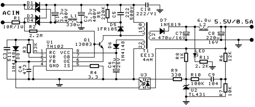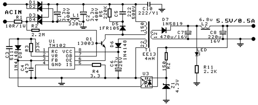 TH102采用穩(wěn)壓管、光耦發(fā)光管(圖2中Z1、U3、RZ)為輸出電壓基準(zhǔn),RZ基于光耦發(fā)光管壓降為Z1提供基電流,改變該基電流(既改變RZ)可小幅改變Z1穩(wěn)壓值,因此,若需較高精度輸出電壓可調(diào)校RZ,調(diào)校RZ可采用成批穩(wěn)壓管分為幾檔,每檔穩(wěn)壓管對應(yīng)一個RZ;或TH102采用TL431(圖3中U2、R6、R7、R8、R9、R10、C9)電路為輸出電壓基準(zhǔn),基準(zhǔn)精度較高和無需調(diào)校。TH102采用光耦隔離反饋電路(圖2中Z1、U3、RZ、C4,圖3中U2、R6、R7、R8、R9、R10、C9、C4)。