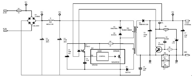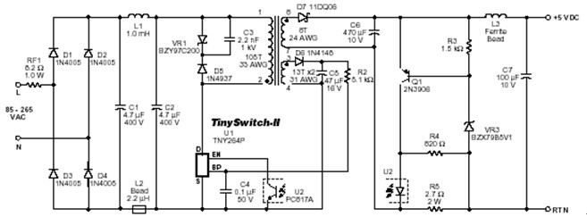 TNY264采用穩(wěn)壓管、光耦發(fā)射二極管為輸出電壓基準(zhǔn)和光耦隔離反饋電路。