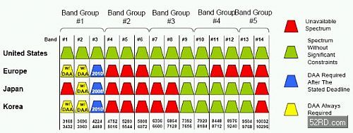 UWB的頻譜跨佔3.168GHz~10.296GHz,并將此區間劃分成5個波段群,除最后的第5個波段群只有2個波段外每個波段群內都有3個波段,總共14個波段,每波段占用528MHz頻寬。一般而言,WUSB使用第1個波段群(3.168GHz~4.488GHz),第2~5個波段群為選用,如果有U-NII(Unlicensed National Information Infrastructure)則必須避用第2個波段群,甚至在不同國度與地區必須避開更多波段群,在美國5個波段群都可使用,但在歐洲就必須避開第2、5、及若干第4波段群的波段。此外,在日本、韓國也多半不允許使用第2及若干第3、5波段群的波段。