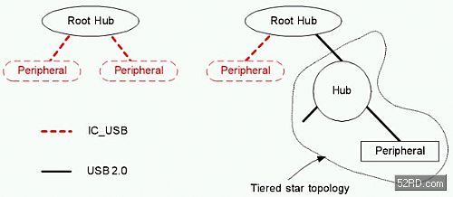 Inter-Chip USB并不支援透過Hub的連接(紅線),只有傳統USB可透過Hub進行連接(黑線)。