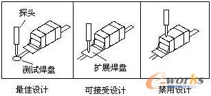 圖6所示為測試點設計的一個示例。通過延伸線在元器件引線附近設置測試焊盤或利用過孔焊盤測試節點,測試節點嚴禁選在元器件的焊點上,這種測試可能使虛焊節點在探針壓力作用下擠壓到理想位置,從而使虛焊故障被掩蓋,發生所謂的“故障遮蔽效應”。由于探針因定位誤差引起的偏晃,可能使探針直接作用于元器件的端點或引腳上而造成元器件損壞。