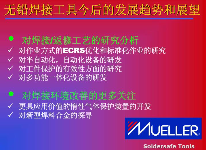 關于無鉛焊接工具今后的發展趨勢和展望,我們應該怎樣去走,這是我要和各位業內朋友一起討論的問題。我在這里提出四個方面。第一是焊接工藝的分析;第二是對焊接環境的改善;第三,對于作業環境的改善;第四是新材料的采用。