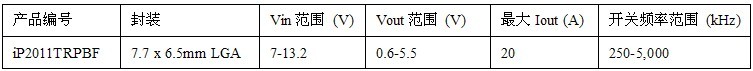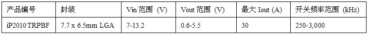 iP2010的輸入電壓范圍為7V至13.2V,輸出電壓范圍則為0.6V至5.5V,輸出電流高達(dá)30A。這個器件最高運(yùn)行頻率為3MHz。在5MHz運(yùn)行時,與iP2010引腳兼容的iP2011備有相同的輸入和輸出電壓范圍,但后者經(jīng)過優(yōu)化,從而使最高輸出電流高達(dá)20A。通過以通用占位面積提供多種電流額定值器件,IR提供的靈活性能夠滿足不同客戶對電流水平、性能和成本的要求。