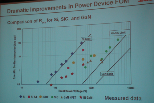 這個采用氮化鉀材料的新器件可以將系統(tǒng)的效率改善3.5%到7%,采用簡單的熱控制即可達(dá)到節(jié)能效果,在目前綠色節(jié)能的大趨勢下可以發(fā)揮重要作用。在改善功率器件的優(yōu)值系數(shù)方面,這個氮化鎵 (GaN) 功率器件也表現(xiàn)突出,如下圖所示。