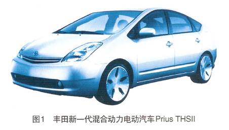 以作為混合動力電動汽車研發前沿的豐田汽車公司為例,所開發的混合動力電動汽車已達到實用化水平,自1997年所推出的世界上第一款批量生產的混合動力電動汽車Prius開始,其后又在2002年推出了混合動力面包車,該車混合動力系統采用了世紀首次批量生產的電動四輪驅動及四輪驅動力/制動力綜合控制系統。2003年,豐田又推出了新一代Prius,也被稱為“新時代豐田混合動力系統——THSⅡ”(見圖1),節能效果可達到100km油耗不足3L。從2004年開始,豐田公司向歐洲市場推出了一款新的LexusRX型豪華混合動力轎車。豐田公司計劃2012年全部采用汽油電力混合發動機,以提高燃油經濟性和降低排放污染。