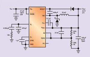 在猝發(fā)模式下,它的靜態(tài)電流低于100礎(chǔ),適合輸入電壓為12V至3.3V的產(chǎn)品。這個器件采用厚度很薄的TSSOP封裝,熱阻非常小,適合尺寸很小的設(shè)計。最后,它使用了電流模式電路,具有良好的瞬態(tài)響應(yīng),容易補償,并且使用一種擁有專利權(quán)的電路,在占空比為任何數(shù)值時保持開關(guān)中的峰值電流恒定。它的開關(guān)頻率是固定的200kHz,此外,這個產(chǎn)品可以同更高的頻率同步。在整個汽車的溫度范圍內(nèi),它的穩(wěn)壓性能很好,并且提供電源正常信號/復(fù)位、軟啟動和UVLO功能。這個電路是一個可靠的、高效率的降壓轉(zhuǎn)換器解決辦法,電流高達(dá)2.5A,尺寸很小,適合汽車使用。