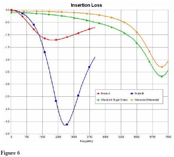 為了比較差分探頭的性能,通常在良好定義和常數(shù)電路中畫出負(fù)載效應(yīng)。比如,每個(gè)探頭在50歐姆理想環(huán)境中產(chǎn)生的插損如Figure 6所示。插損用dB表示;作為電壓表示,必須除以20,采用反對(duì)數(shù)。比如Probe B導(dǎo)致的4.6dB的插損會(huì)產(chǎn)生41%的幅度損失。這對(duì)于被探測(cè)的信號(hào)有顯著影響。
