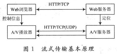 需要說明的是,在流式傳輸中,使用RTP/UDP和RTSP/TCP兩種不同的通信協(xié)議與A/V服務(wù)器建立聯(lián)系,是為了能夠把服務(wù)器的輸出重定向到一個不同于運行A/VHelper程序所在客戶機的目的地址。實現(xiàn)流式傳輸一般都需要專用服務(wù)器和播放器,其基本原理如圖1所示。