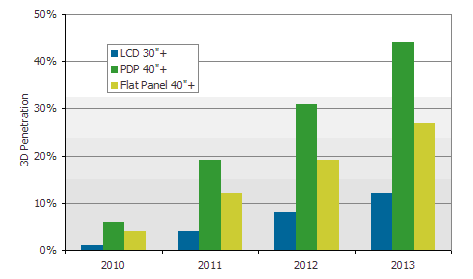 Paul指出3D電視剛開始以大尺寸產品為主,同時需要結合如藍光DVD與3D數字廣播系統等才有機會引發消費者購買,因此預估今年主要出貨將以北美市場為主,北美將占有全球超過50%出貨量。另外與其它機種比較,具備3D功能的影像處理器與增加顯示功能方案成本都非常昂貴,也因此3D市場成長將受限于倍頻與雙倍頻機種的滲透率。DisplaySearch預估到了2013年3D電視占所有40寸及以上尺寸電視出貨量比率將僅有27%。除了成本因素外,西歐地區目前藍光DVD與高清播放系統滲透率仍低,如此一來對于3D內容提供形成一定障礙,也對于3D電視成長造成一些影響。