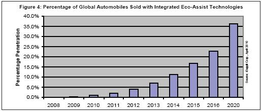 如圖4所示,到2020年,全球銷售的汽車中將有36.2%包含節(jié)能導航系統(tǒng),這是最受歡迎的節(jié)能駕駛輔助系統(tǒng)類型。2010年上述比例是0.7%。