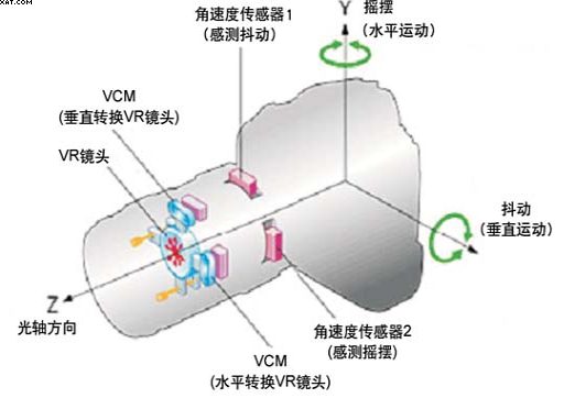 鏡頭防抖是通過鏡片的移動來補償相機的抖動,它由傳感器,微處理器,補償鏡片控制組,驅(qū)動控制部分組成,依靠補償鏡片的移動來校正手抖引起的光線偏移,如圖1,鏡頭不同,設(shè)計上有差異,但基本上都是透過補償鏡片組來補償。CCD防抖是通過感光元器件CCD(或CMOS)放在一個可移動支架上來,通過傳感器感知相機的抖動,由微處理器計算相應(yīng)的移動量,由驅(qū)動部分對CCD移動,以達到防抖目的。目前,一般相機的防抖(CCD防抖或光學(xué)防抖)不是無限可以補償,一般為2~~3級,按表一來說,假設(shè)安全快門1/125,2級,快門速度1/30,快于此速度,容易拍清晰的照片,由此類推,3級,快門速度為1/15。表2為三種防抖方式的比對表。
