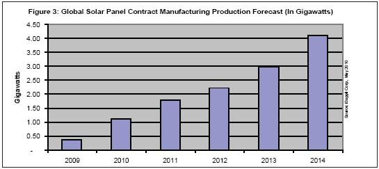 2010年合同制造商將生產(chǎn)1.1GW的太陽(yáng)能電池板,比2009年時(shí)的369MW大增200%。其余的生產(chǎn)任務(wù)將由專門(mén)的太陽(yáng)能電池板廠商以及其它企業(yè)承擔(dān)。2014年合同制造商生產(chǎn)的太陽(yáng)能電池板將比2010年增長(zhǎng)近三倍,達(dá)到4.1GW。