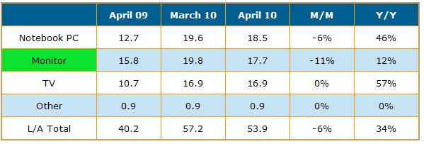 表一 2010年3-4月大尺寸TFT LCD面板按應(yīng)用出貨量(單位:百萬片)