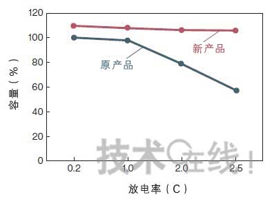 新產品不但容量大,大電流下的充放電特性也十分出色。充電時間可比原產品縮短約30%。放電方面,即使在2.5C的放電率下容量也不會降低,可用于高輸出產品(圖2)注1)。