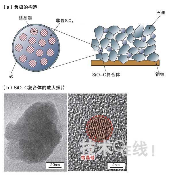 負極采用日立麥克賽爾量產的硅類材料的單元混合了SiO-C復合體和石墨(a)。SiO-C將nm級的硅分散到非晶SiO2的構造體內(b)。圖由本站根據日立麥克賽爾的資料制作。