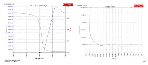 圖5.利用吉時利4200-SCS進行參數(shù)提取的實例表現(xiàn)了半導體的摻雜特征(左邊的藍線),它與1/C2與Vg的關系呈倒數(shù)關系(紅線)。右圖給出了摻雜分布,即每立方厘米的載流子數(shù)與襯底深度的函數(shù)關系。