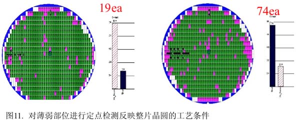 最終的實驗證明自動工藝檢測結果與最終良率的對應關系。表明自動工藝檢測可以反映存儲單元內接觸孔通孔刻蝕的狀態。對于在生產線上檢驗到薄弱部位有刻蝕不完全比較多的晶圓,其對應的正常存儲單元內也有較多的接觸孔有刻蝕不完全問題??梢酝ㄟ^對產品的薄弱部位進行監測達到對正常存儲單元內接觸孔刻蝕狀態的實時反映,這對接觸孔的刻蝕工藝改進有極大的促進作用(如圖11所示)。