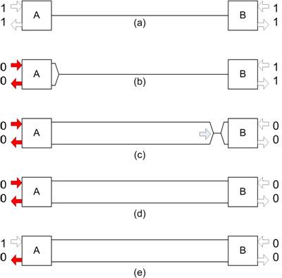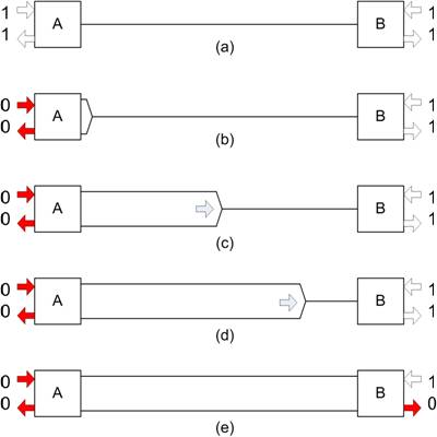 我們的下一種情況(圖2)假設(shè),節(jié)點(diǎn)A再次發(fā)起一條消息,但是節(jié)點(diǎn)B在稍后發(fā)起的一條消息具有更高的優(yōu)先級(jí)。如前所述,這種情況以?xún)蓚€(gè)節(jié)點(diǎn)均處在非占用模式作為開(kāi)始,如(2a所示,隨后節(jié)點(diǎn)A變?yōu)檎加茫ㄈ纾?b)所示)發(fā)起一條消息。該占用差動(dòng)電壓再次沿線(xiàn)纜傳輸。在信號(hào)到達(dá)B處的收發(fā)器以前,該節(jié)點(diǎn)剛好利用如(2c)所示占用位發(fā)起一條消息。這時(shí),兩個(gè)節(jié)點(diǎn)都正傳輸一個(gè)占用位,并且兩個(gè)節(jié)點(diǎn)都正接收一個(gè)占用位(如(2d)所示),然后兩個(gè)節(jié)點(diǎn)都沒(méi)意識(shí)到另一個(gè)節(jié)點(diǎn)也已啟用。由于在我們的假設(shè)情況中,節(jié)點(diǎn)A具有比節(jié)點(diǎn)B更低的優(yōu)先級(jí),因此有時(shí)節(jié)點(diǎn)A會(huì)通過(guò)將其TXD設(shè)置為0(如(2e)所示)來(lái)發(fā)出一個(gè)非占用位。但是,由于節(jié)點(diǎn)B的作用,RXD會(huì)感應(yīng)到總線(xiàn)仍然處在占用狀態(tài)下。