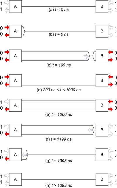 圖3中,節(jié)點(diǎn)A在時(shí)間t=0時(shí)開(kāi)始一條消息,從而在總線(xiàn)(b)上傳輸一個(gè)占用位。如圖2所示,其可能出現(xiàn)的情況是,節(jié)點(diǎn)B剛好在節(jié)點(diǎn)A的信號(hào)被接收到以前(c)開(kāi)始發(fā)送,也即時(shí)間t=199ns。當(dāng)時(shí)間t=1000ns的第二位開(kāi)始之初,在節(jié)點(diǎn)A轉(zhuǎn)到非占用狀態(tài)以前兩個(gè)節(jié)點(diǎn)都沒(méi)意識(shí)到對(duì)方的有效性。然后,節(jié)點(diǎn)B在時(shí)間t=1199ns的第二位開(kāi)始之初,轉(zhuǎn)到非占用狀態(tài)。另一個(gè)單向延遲以后,該非占用信號(hào)到達(dá)節(jié)點(diǎn)A,時(shí)間t=1399ns。只有在這時(shí),節(jié)點(diǎn)A才讀取RXD信號(hào),并且可以確定其代表網(wǎng)絡(luò)的真實(shí)狀態(tài)。