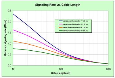 下面顯示了信號(hào)速率和線(xiàn)纜長(zhǎng)度之間的權(quán)衡因素,以及收發(fā)器延遲帶來(lái)的影響。收發(fā)器帶來(lái)的延遲(包括相關(guān)隔離、電平轉(zhuǎn)換和保護(hù))對(duì)于500kbps及以上的信號(hào)速率特別明顯。