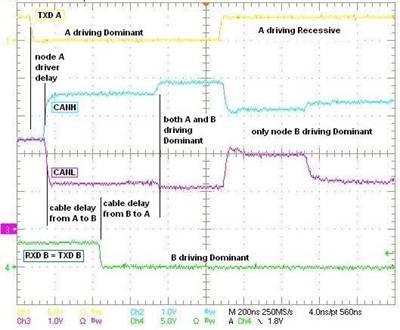 通過(guò)研究某個(gè)具有實(shí)際延遲值的假設(shè)案例,我們可以更加具體地介紹這些計(jì)時(shí)要求。在我們的二節(jié)點(diǎn)例子中,設(shè)定總單向延遲為200ns,信號(hào)傳輸速率為1Mbps,也就是ISO11898-2標(biāo)準(zhǔn)規(guī)定的最大值。這樣,位時(shí)間便為1000ns。除節(jié)點(diǎn)B的第二位會(huì)是同節(jié)點(diǎn)A的消息優(yōu)先級(jí)匹配的0(非占用)以外,其同情況2所述一樣。(情況2中,節(jié)點(diǎn)B具有一個(gè)占用第二位,表明更高的消息優(yōu)先級(jí)。)