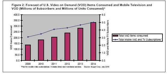 2010年美國(guó)移動(dòng)視頻點(diǎn)播(VOD)和移動(dòng)電視活躍用戶預(yù)計(jì)增長(zhǎng)到350萬個(gè),2009年是310萬個(gè)。隨后幾年用戶數(shù)量預(yù)計(jì)繼續(xù)增長(zhǎng),到2014年達(dá)到500萬個(gè)。