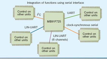 車用MCU連接的外圍相當(dāng)多樣,而連接的接口可能是UART、頻率同步串行、LIN-UART和I2C,因此必須具備彈性的接口連接能力。為了滿足此需求,富士通將內(nèi)置式多功能串行接口用作串行通信接口,并透過軟件方式來切換上述各種接口,以靈活支持外部組件的通信規(guī)范,并提高系統(tǒng)設(shè)計的自由度。新系列MCU還提供LIN-UART的6條通道,從而能夠與更多控制單元進行通信;其中MB91725系列因具有定時器功能的多條信道和A/D轉(zhuǎn)換器,更容易達成各種功能的整合。請參考(圖二)。